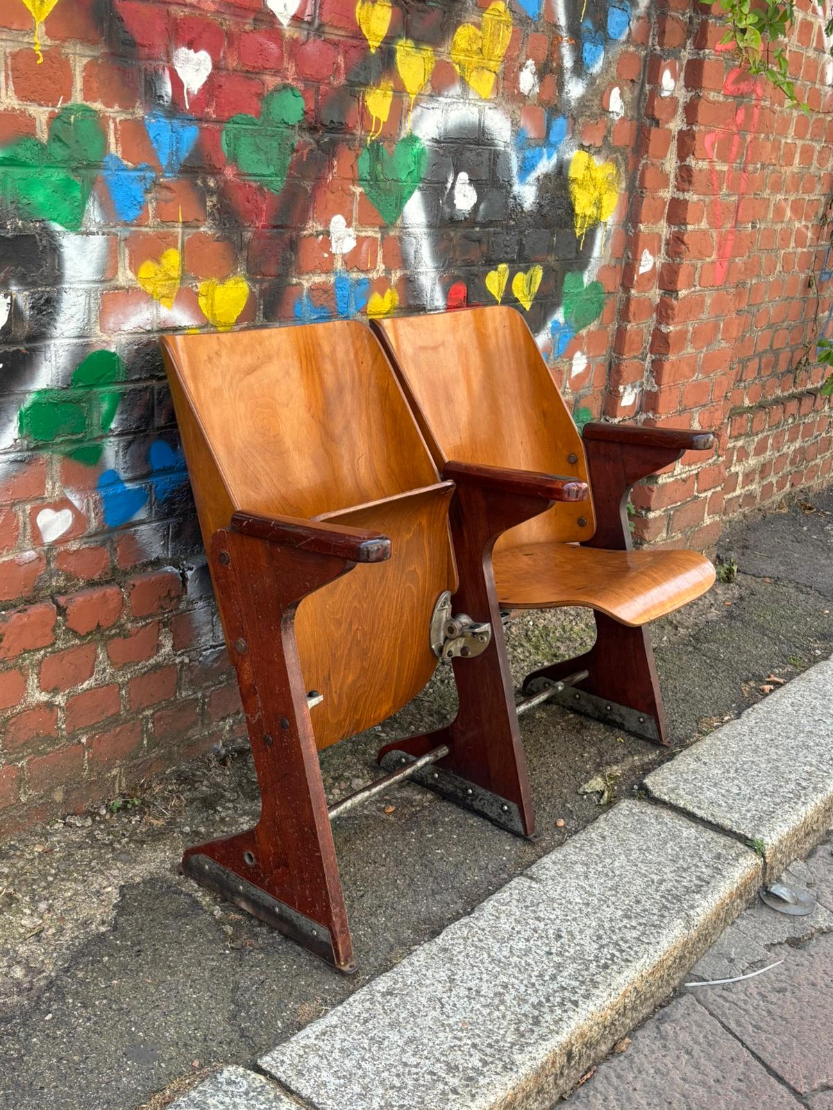 Condizioni: buone, segni del tempo. Sedie in legno massello di mogano su i lati con legno termo formato sulla seduta.