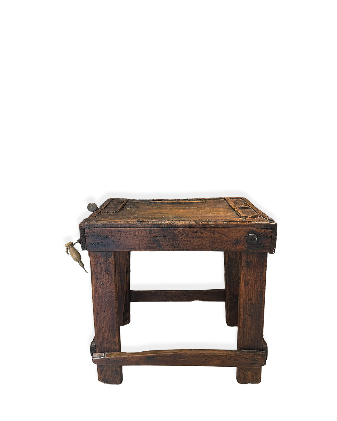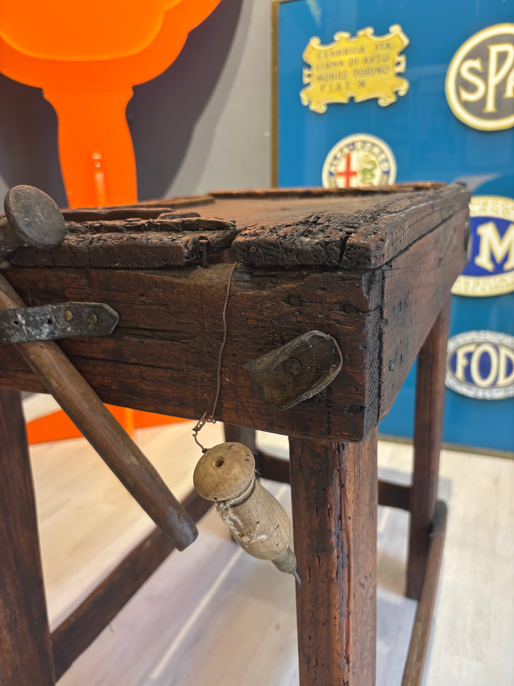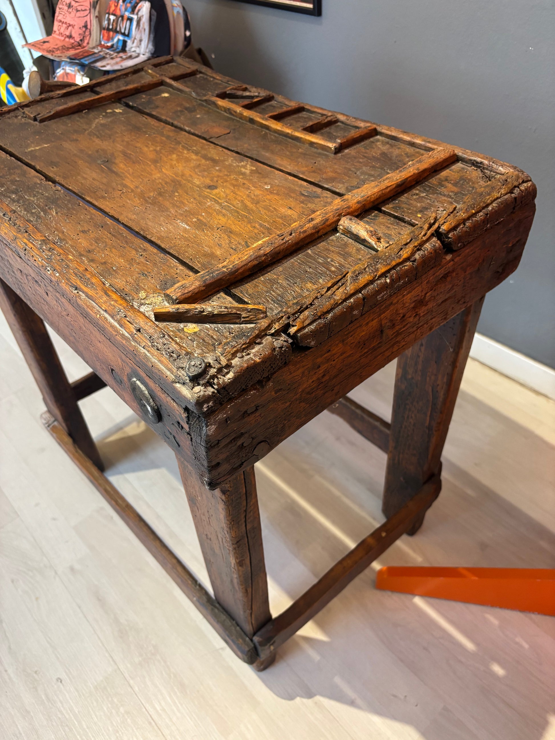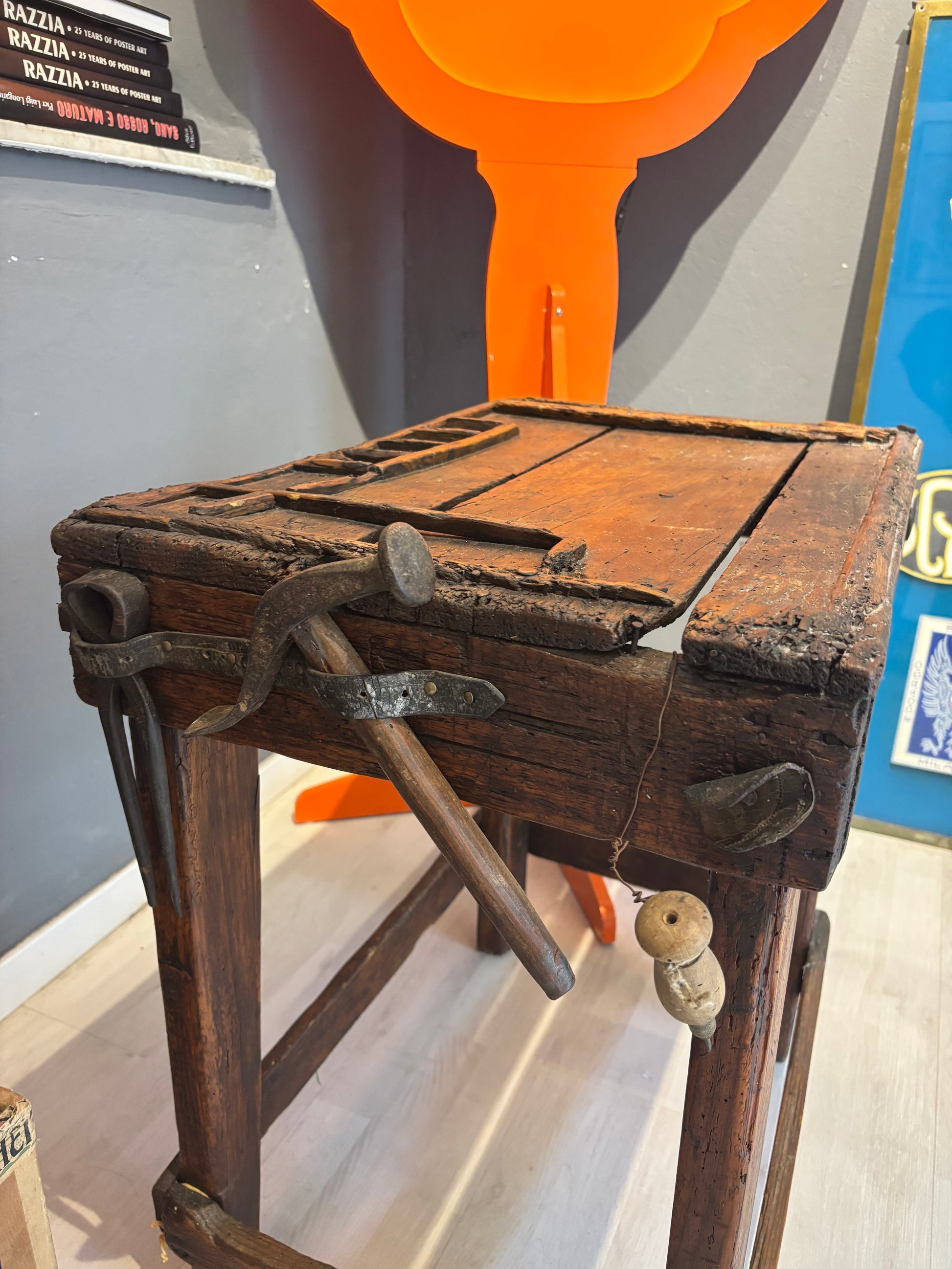 Descrizione : Antico banco da calzolaio in legno massiccio, risalente ai primi del Novecento. Presenta una struttura compatta e solida, con morsetto metallico originale e piano di lavoro segnato dall’uso.