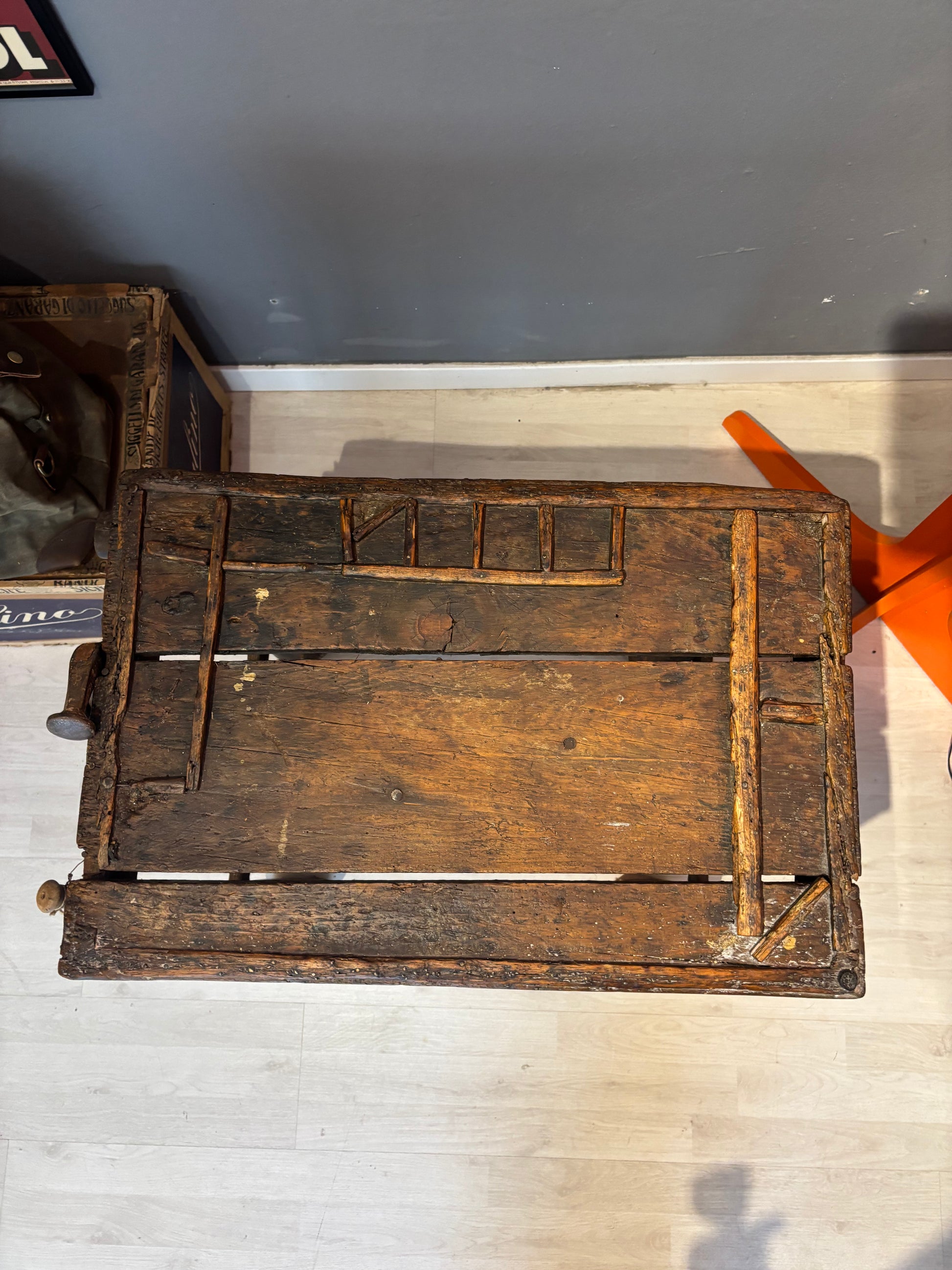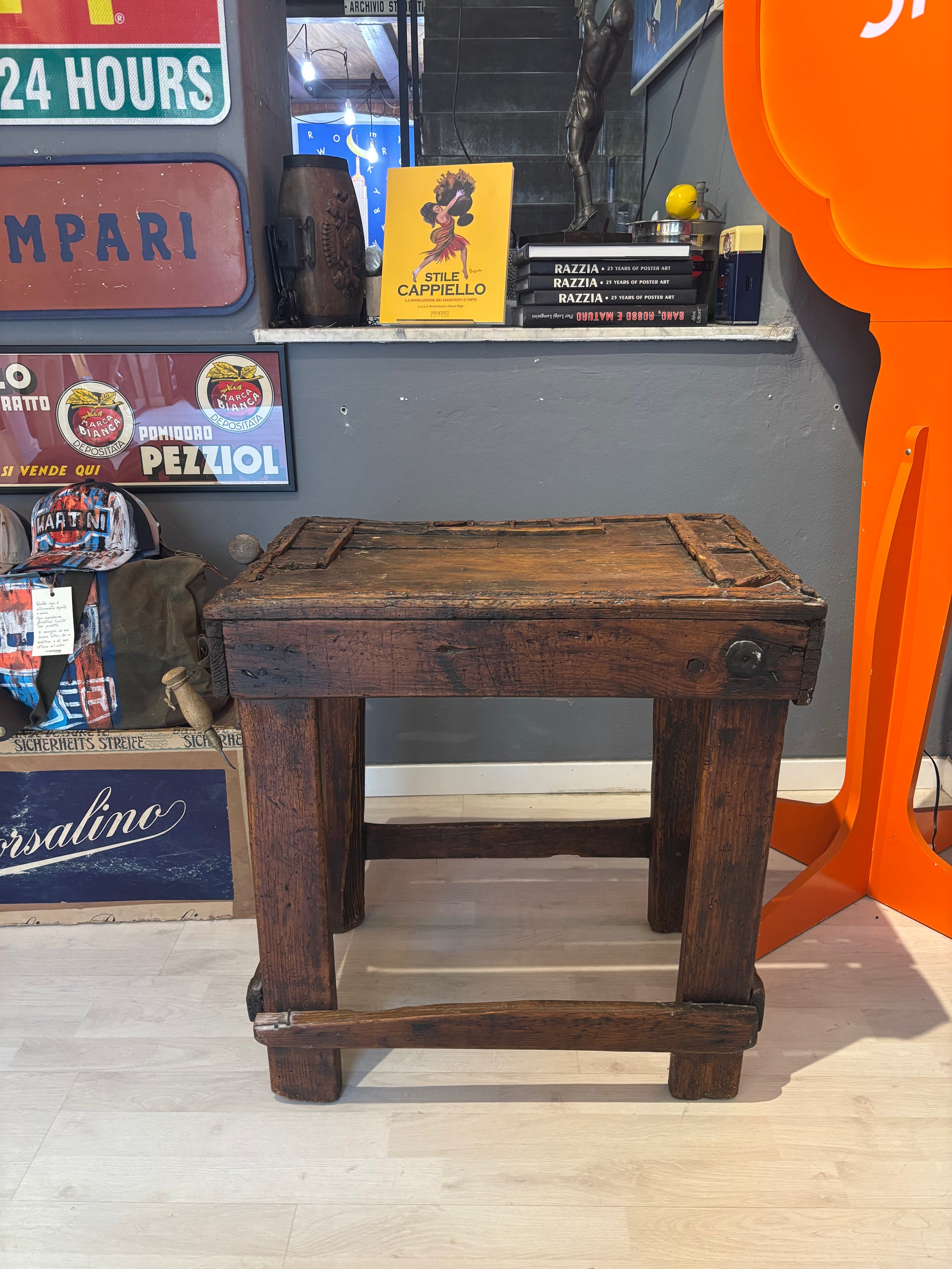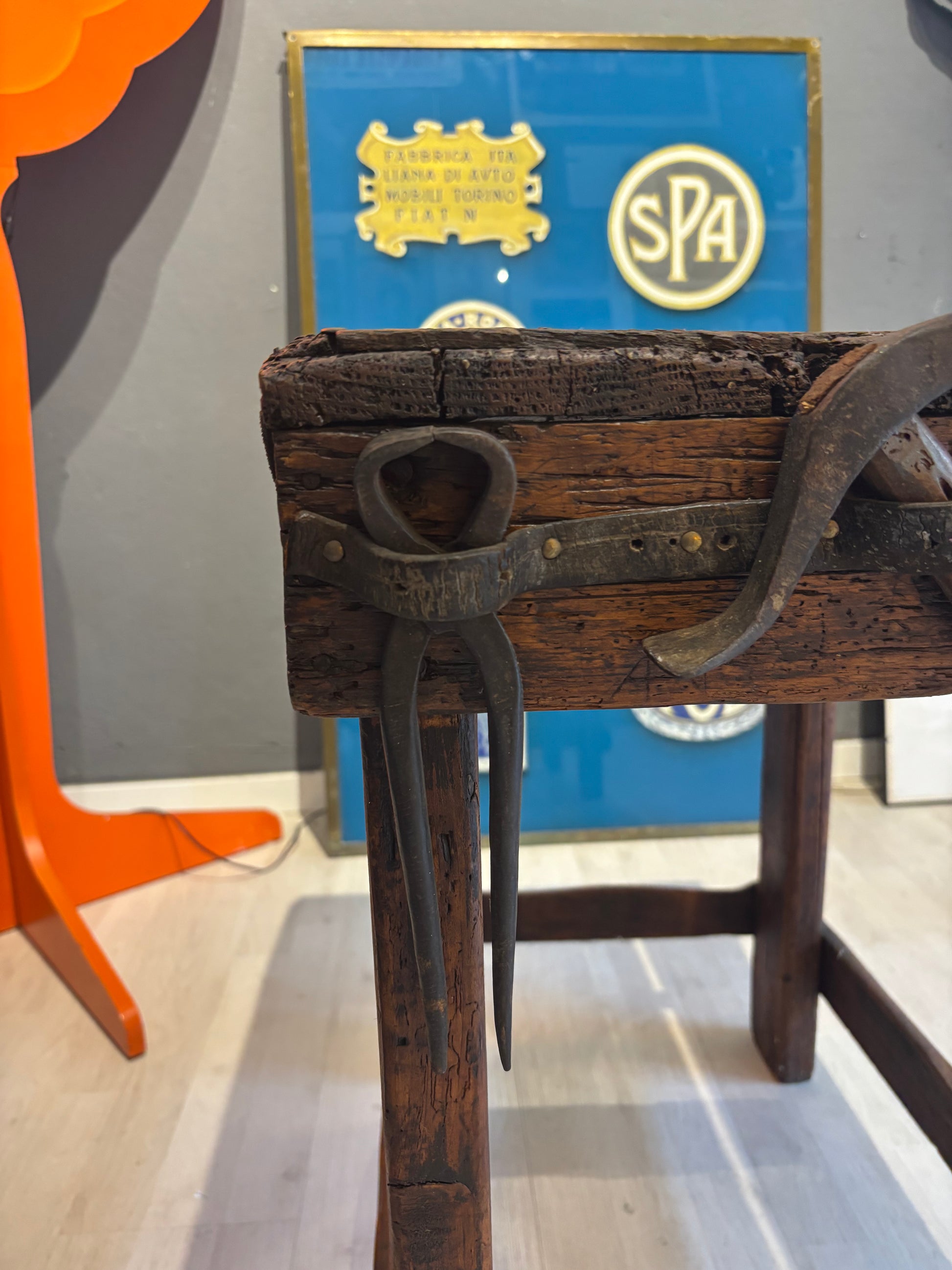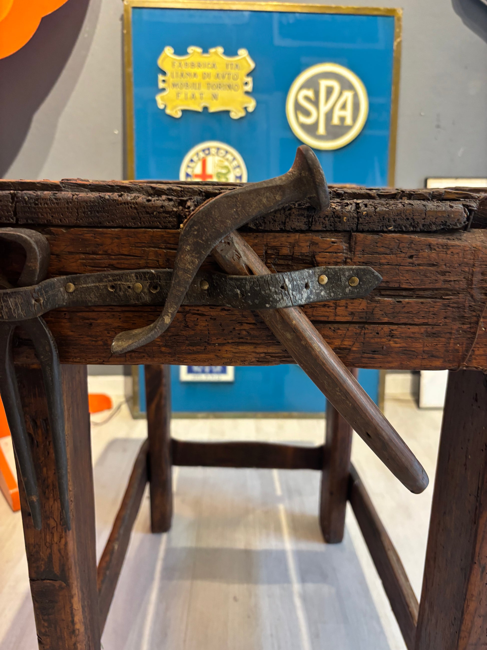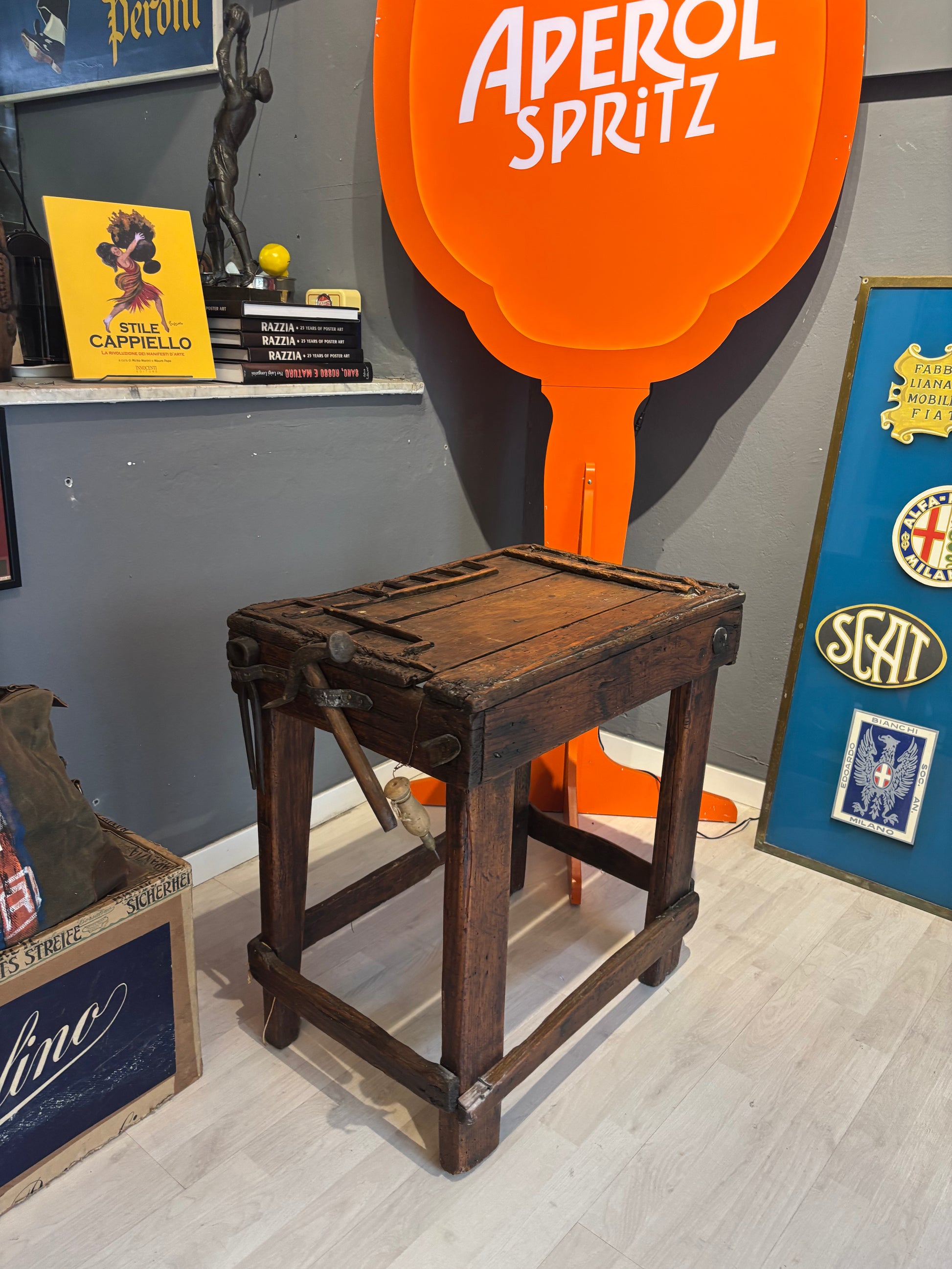 Descrizione : Antico banco da calzolaio in legno massiccio, risalente ai primi del Novecento. Presenta una struttura compatta e solida, con morsetto metallico originale e piano di lavoro segnato dall’uso.